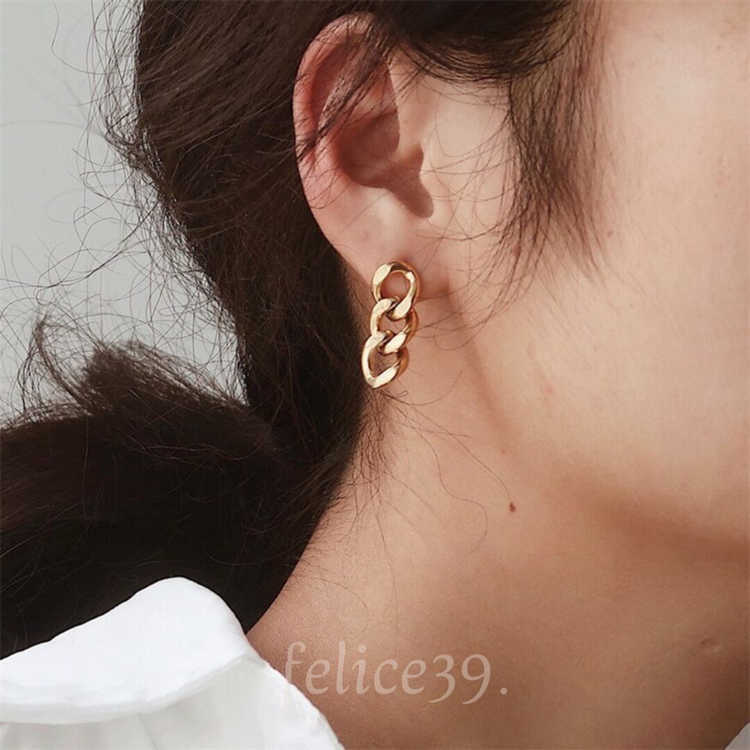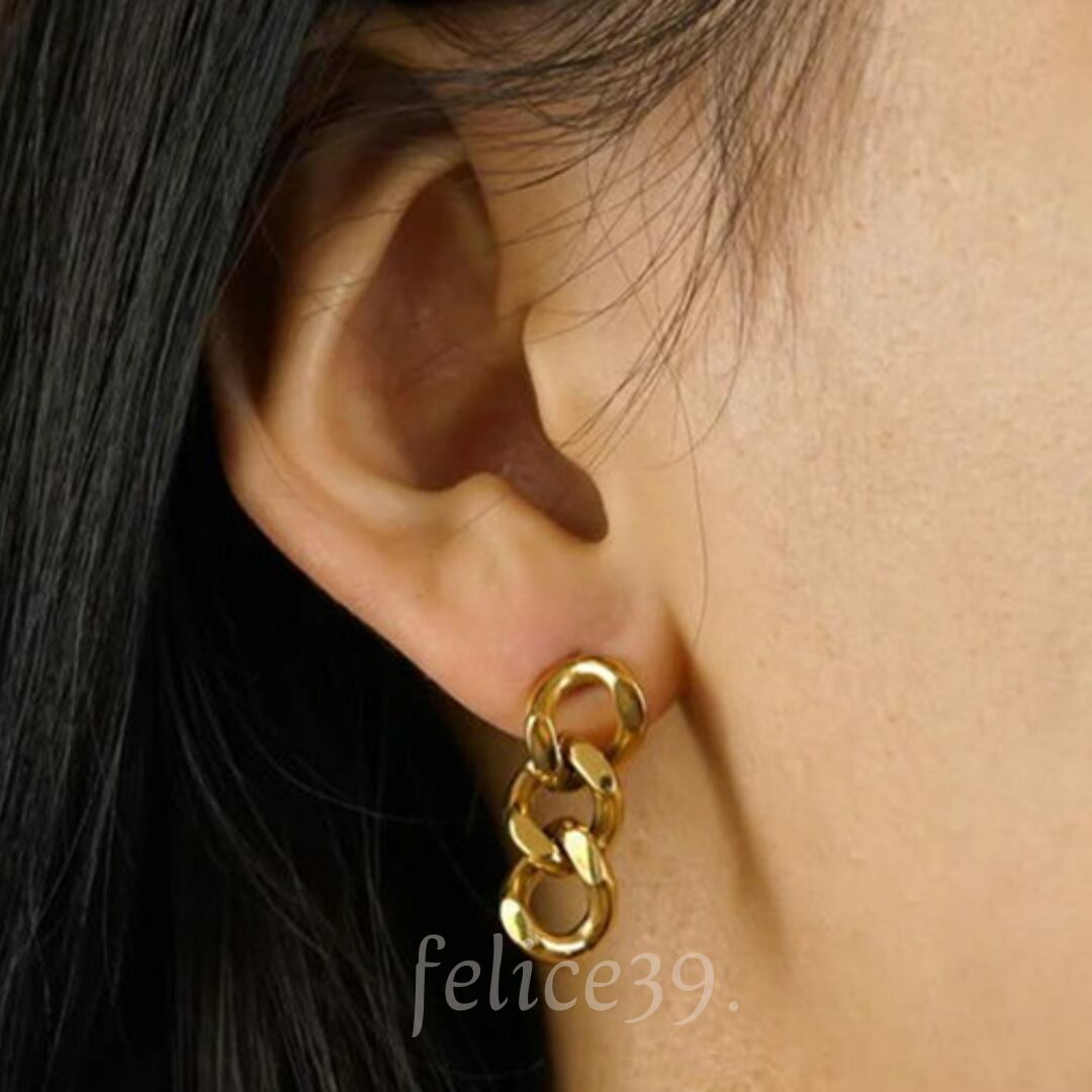 3つの連なったチェーンが、耳元で揺れるたびに輝きを放ちます。